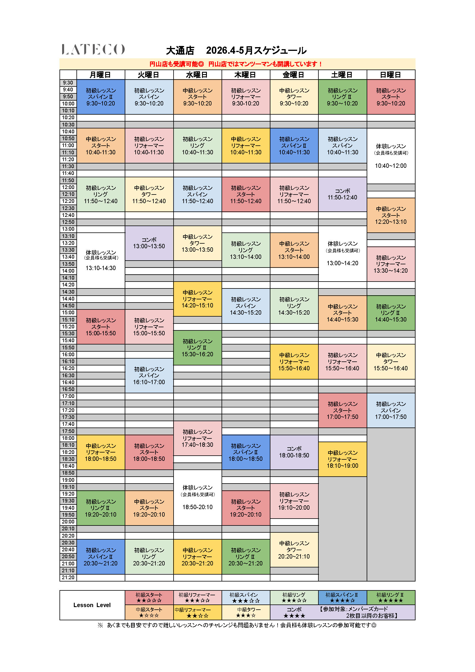 大通店の4月・5月のレッスンスケジュールです。